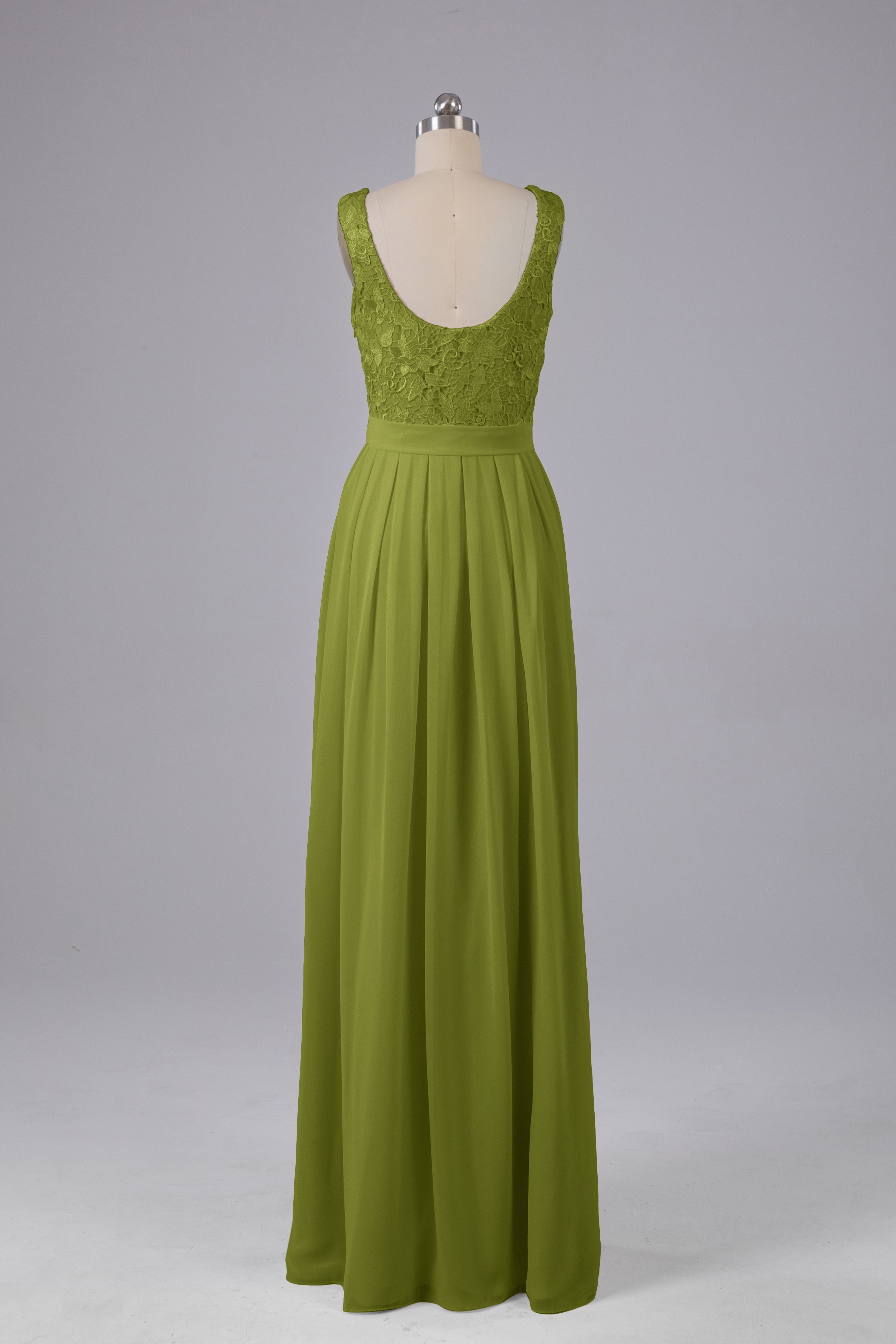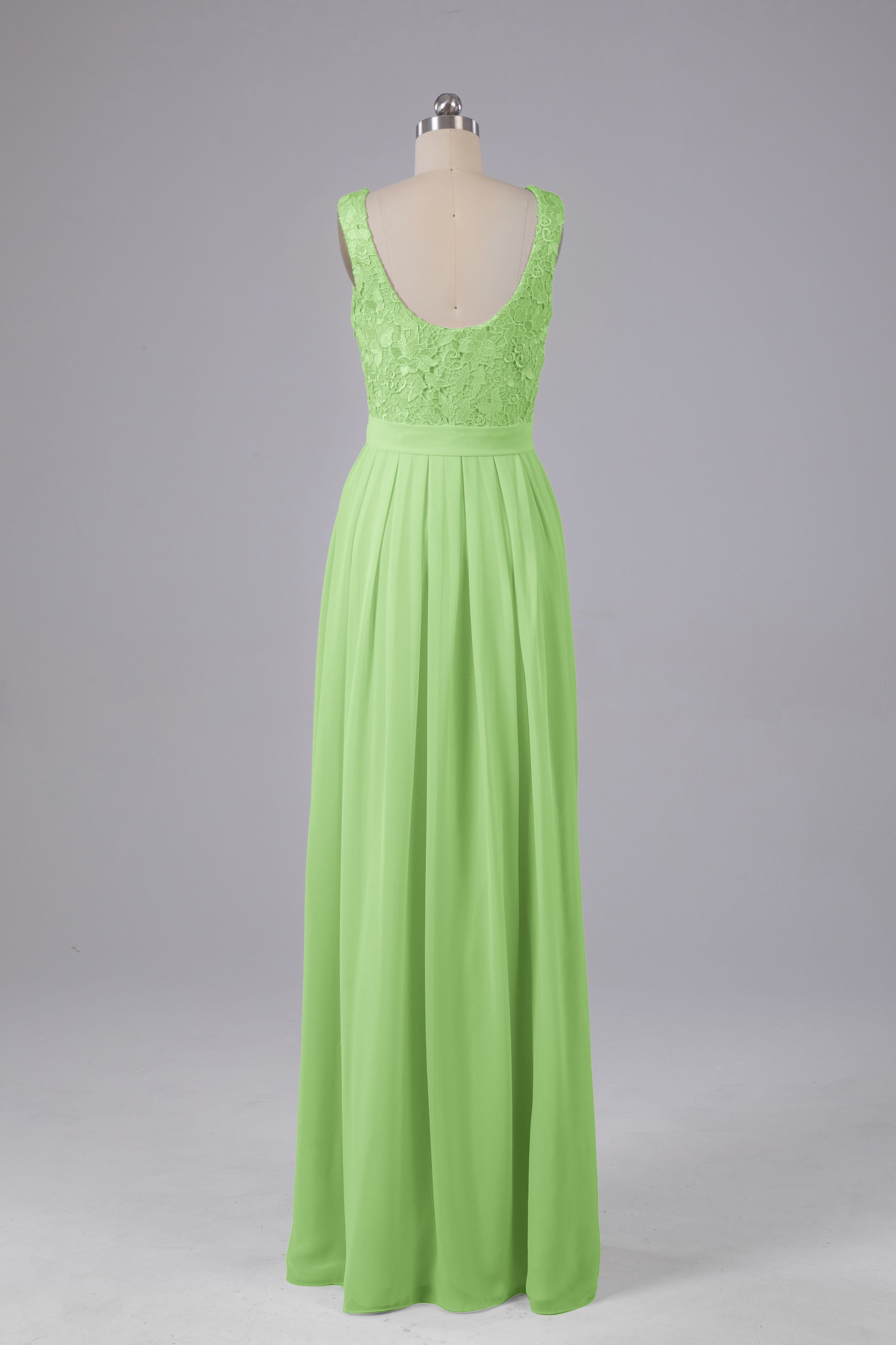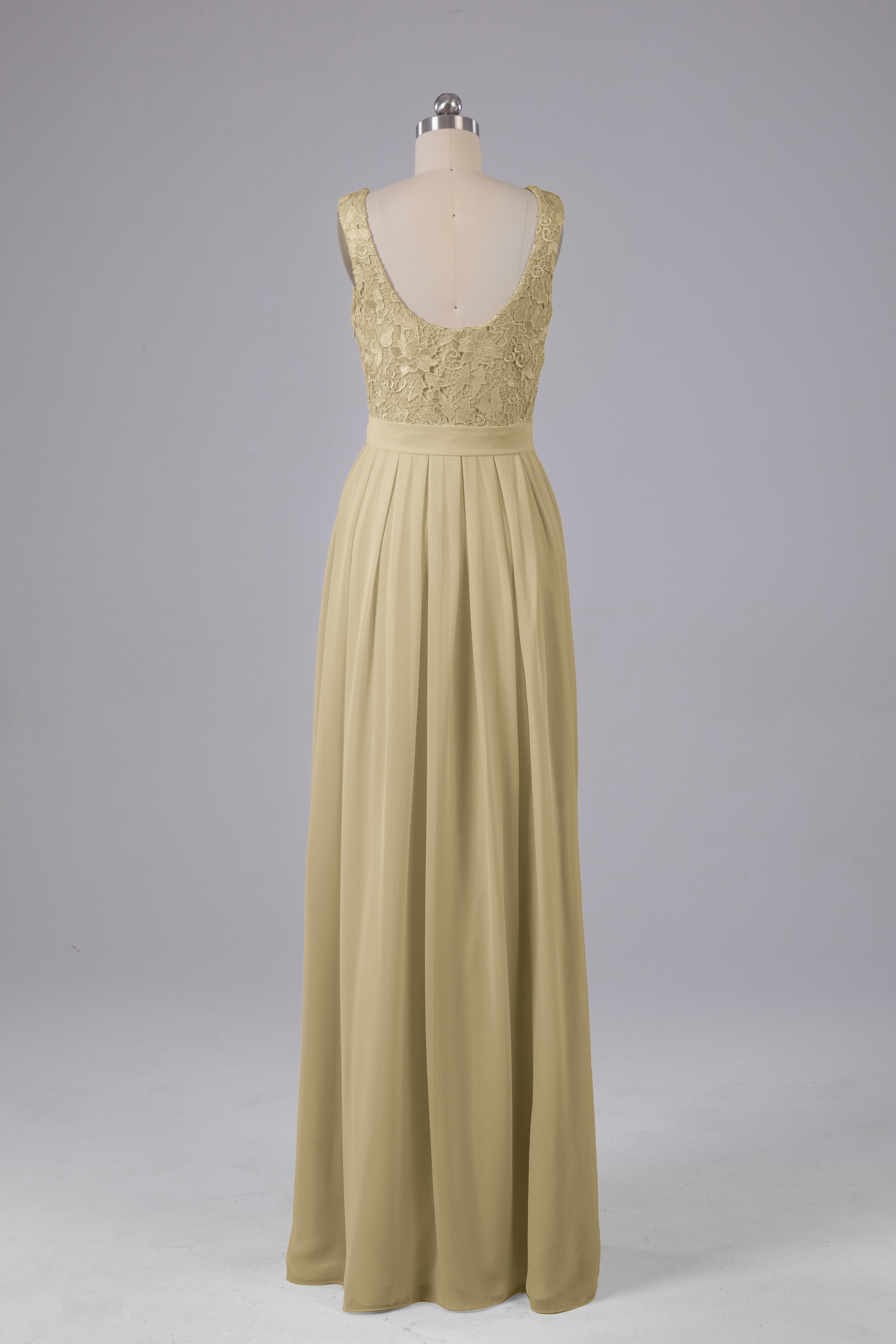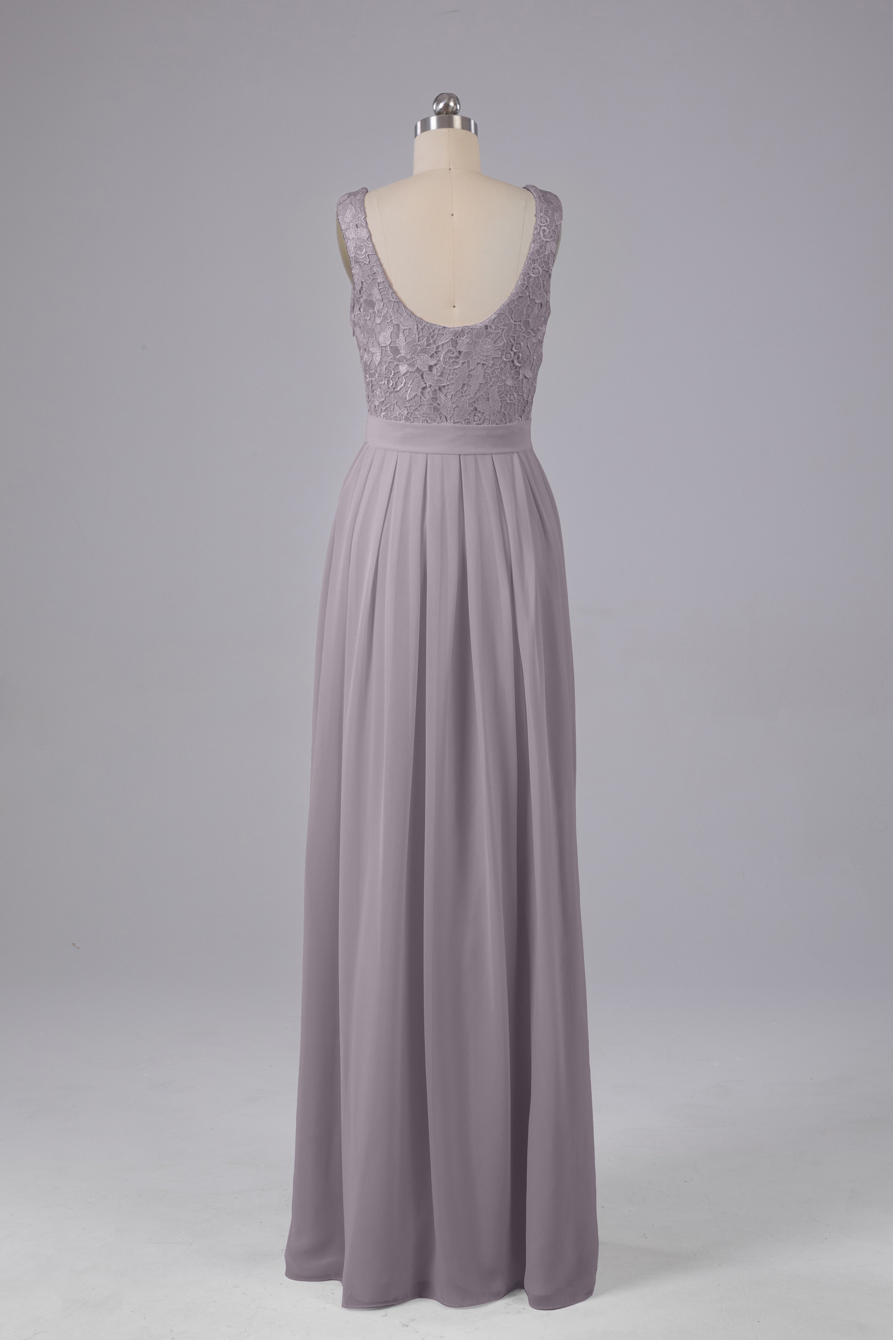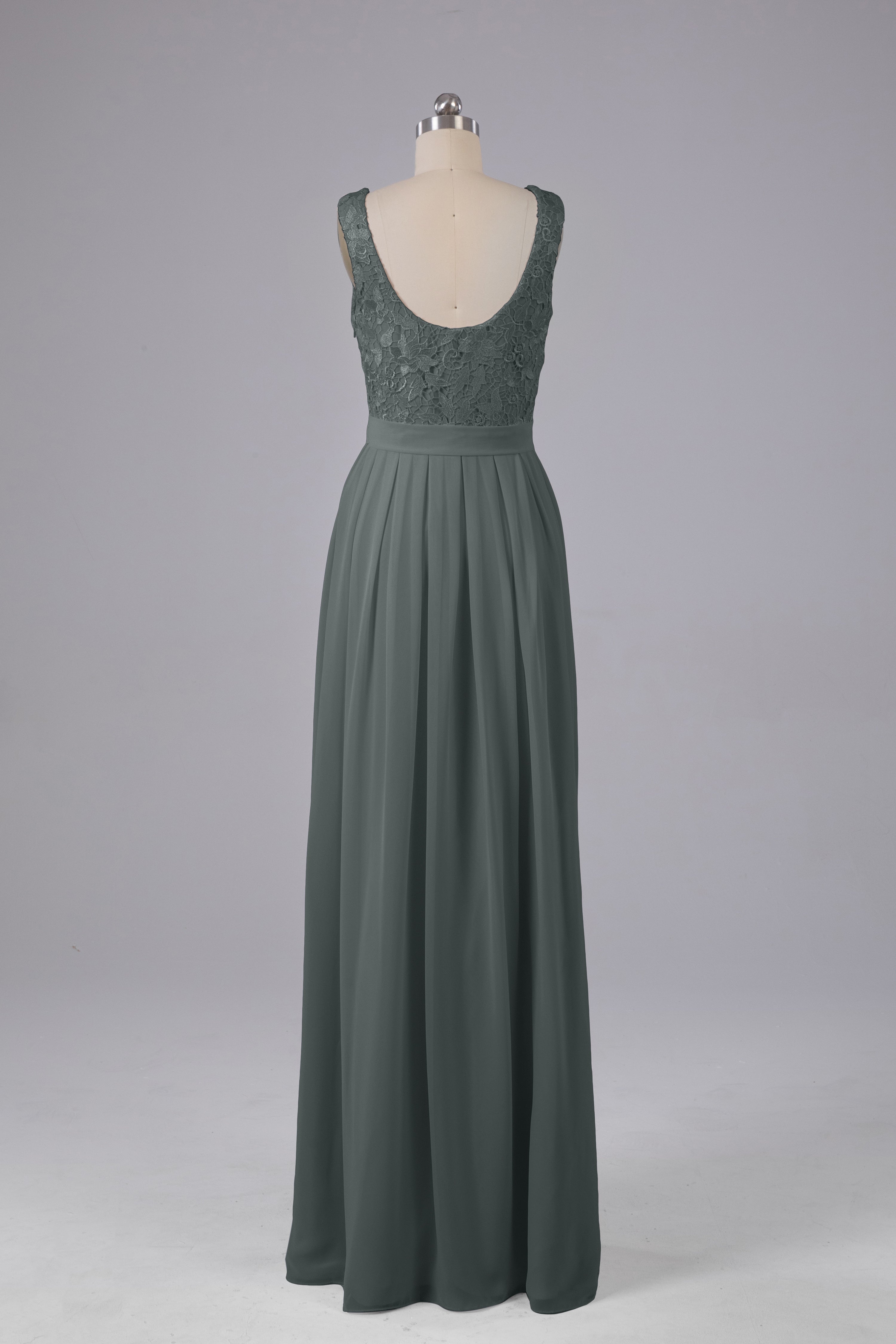 This floor-length bridesmaid dress features an A-line silhouette, delicate lace top, and flowing chiffon fabric. Perfect for any wedding, it offers a timeless and elegant look that will flatter all body types. Made with quality materials, this dress combines fashion and comfort for a memorable and stylish bridal party.