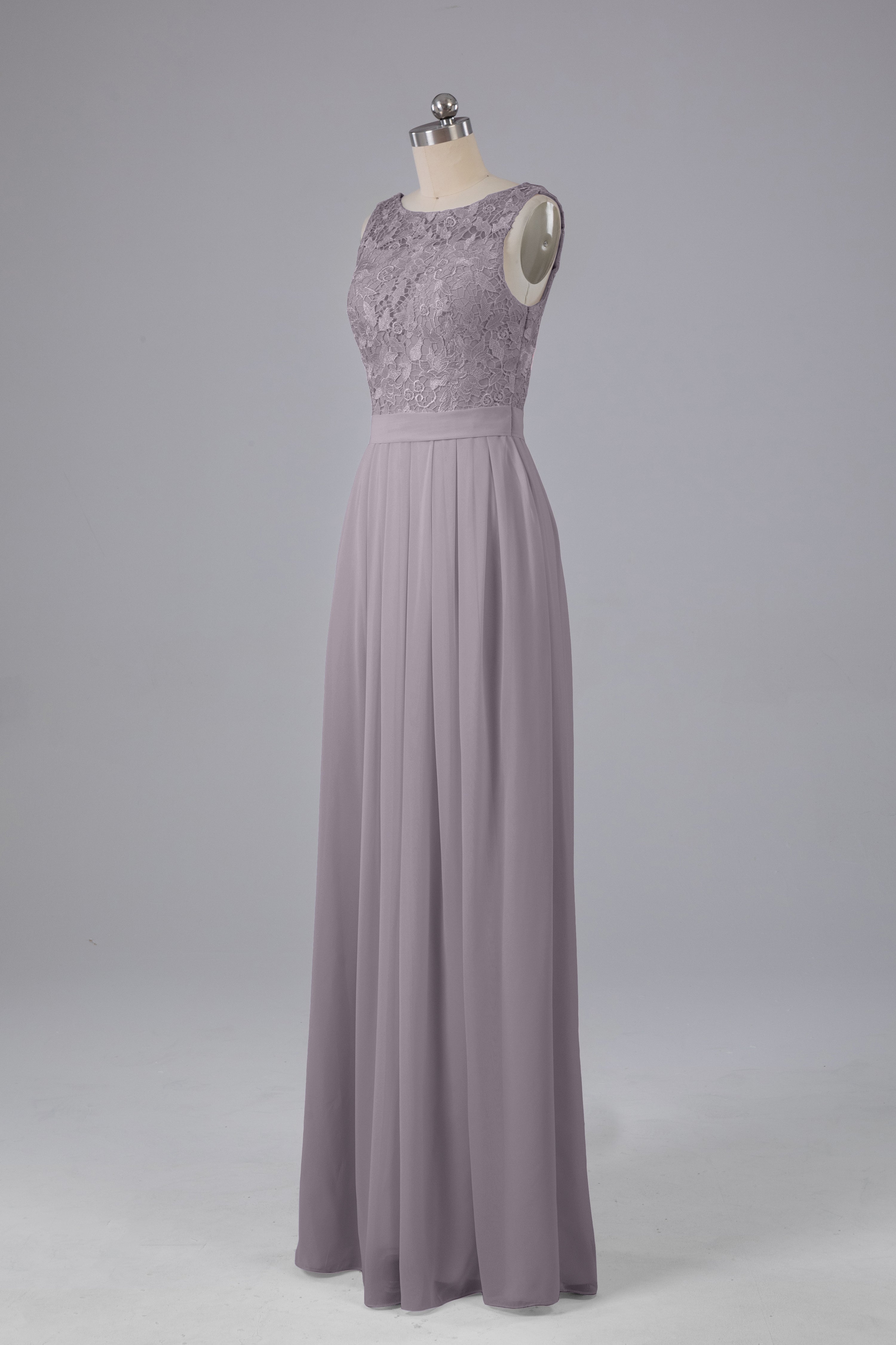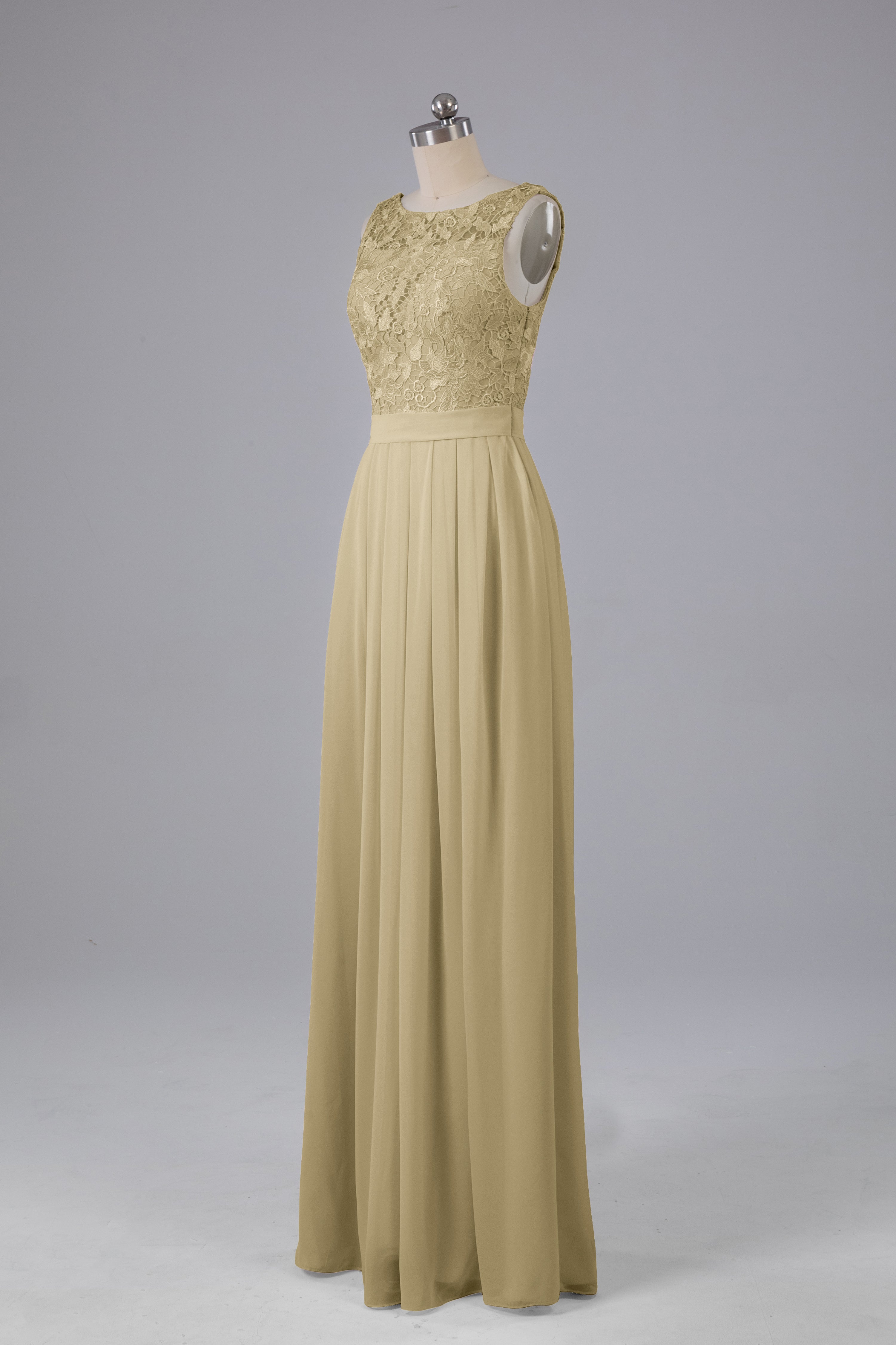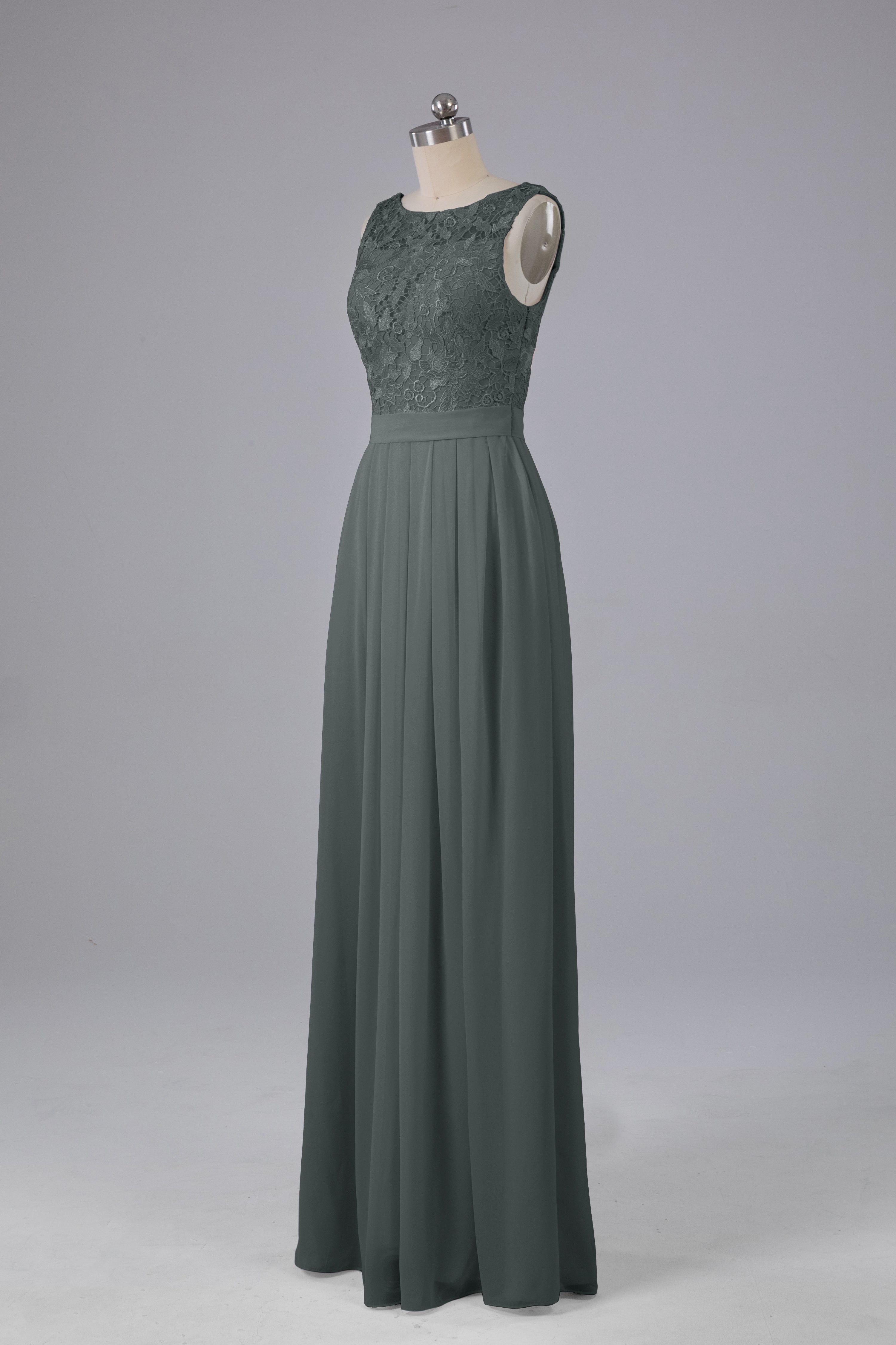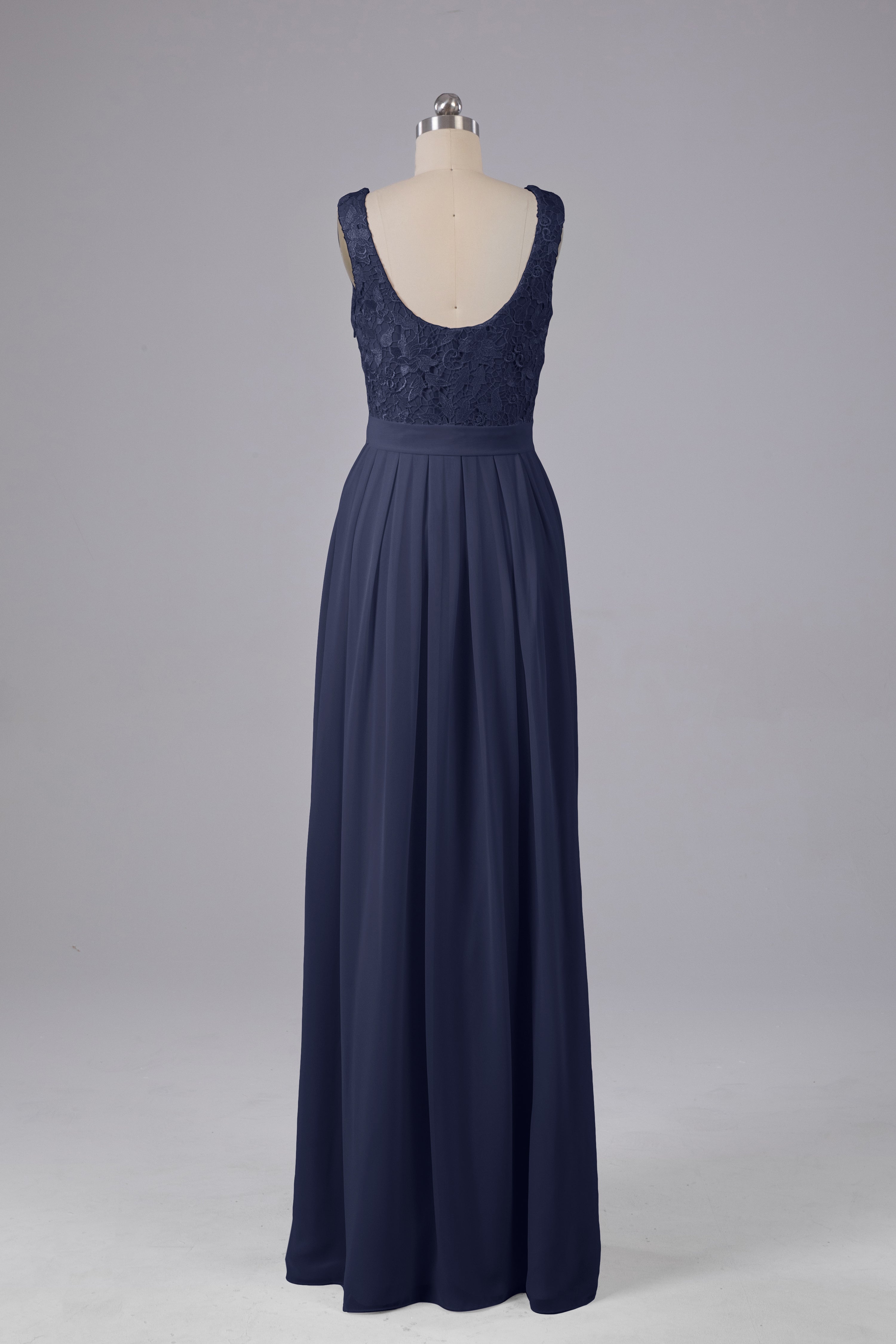 This floor-length bridesmaid dress features an A-line silhouette, delicate lace top, and flowing chiffon fabric. Perfect for any wedding, it offers a timeless and elegant look that will flatter all body types. Made with quality materials, this dress combines fashion and comfort for a memorable and stylish bridal party.