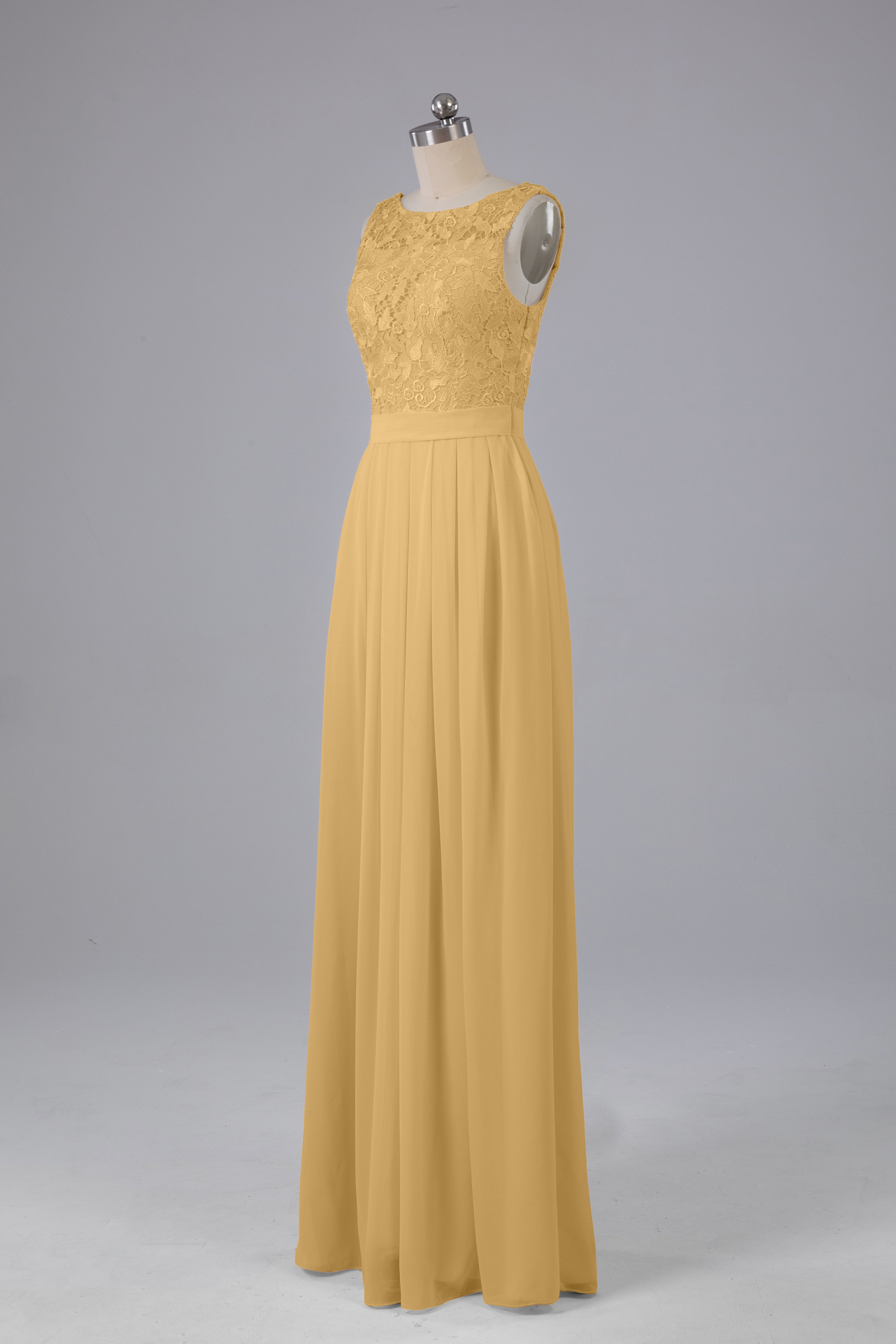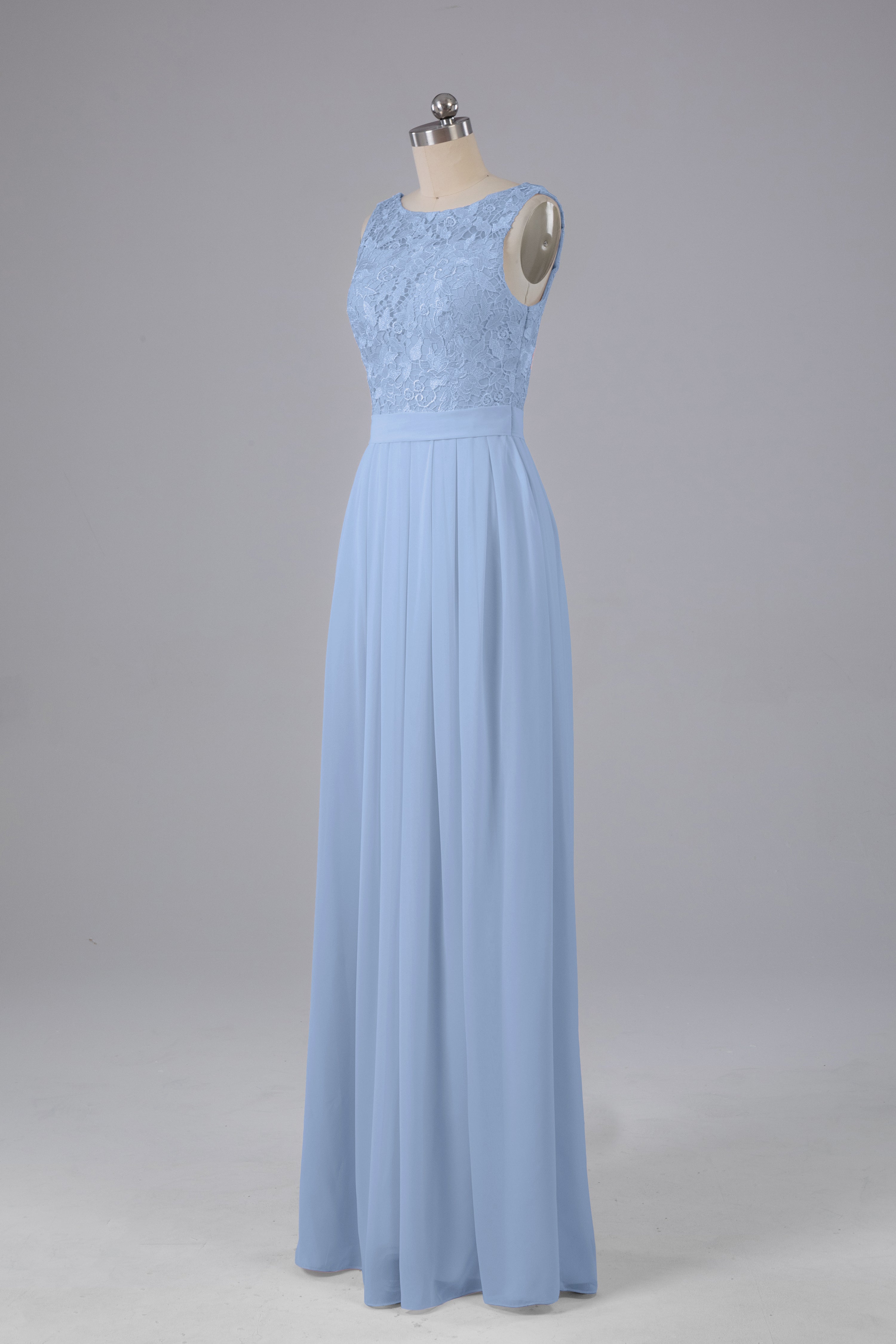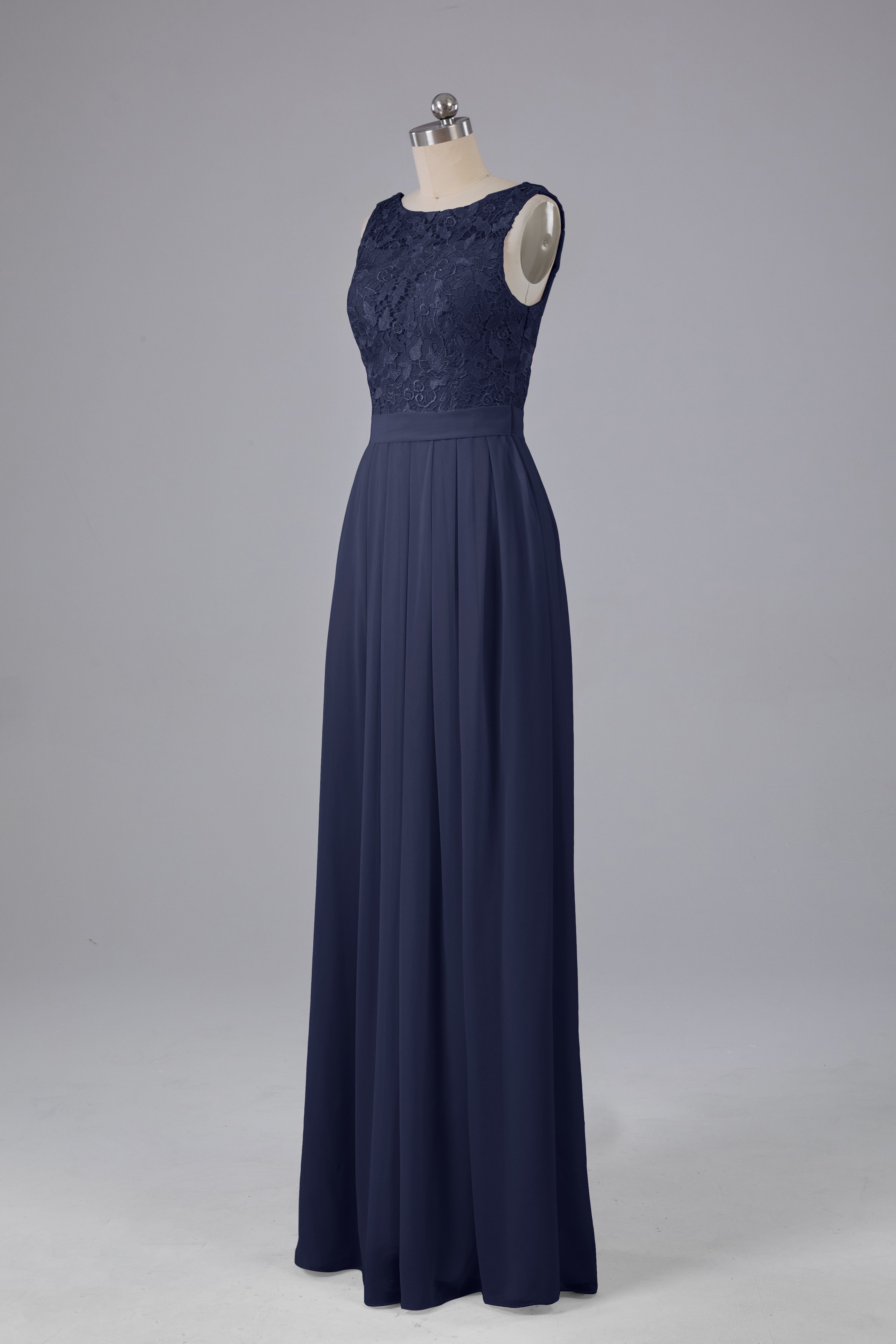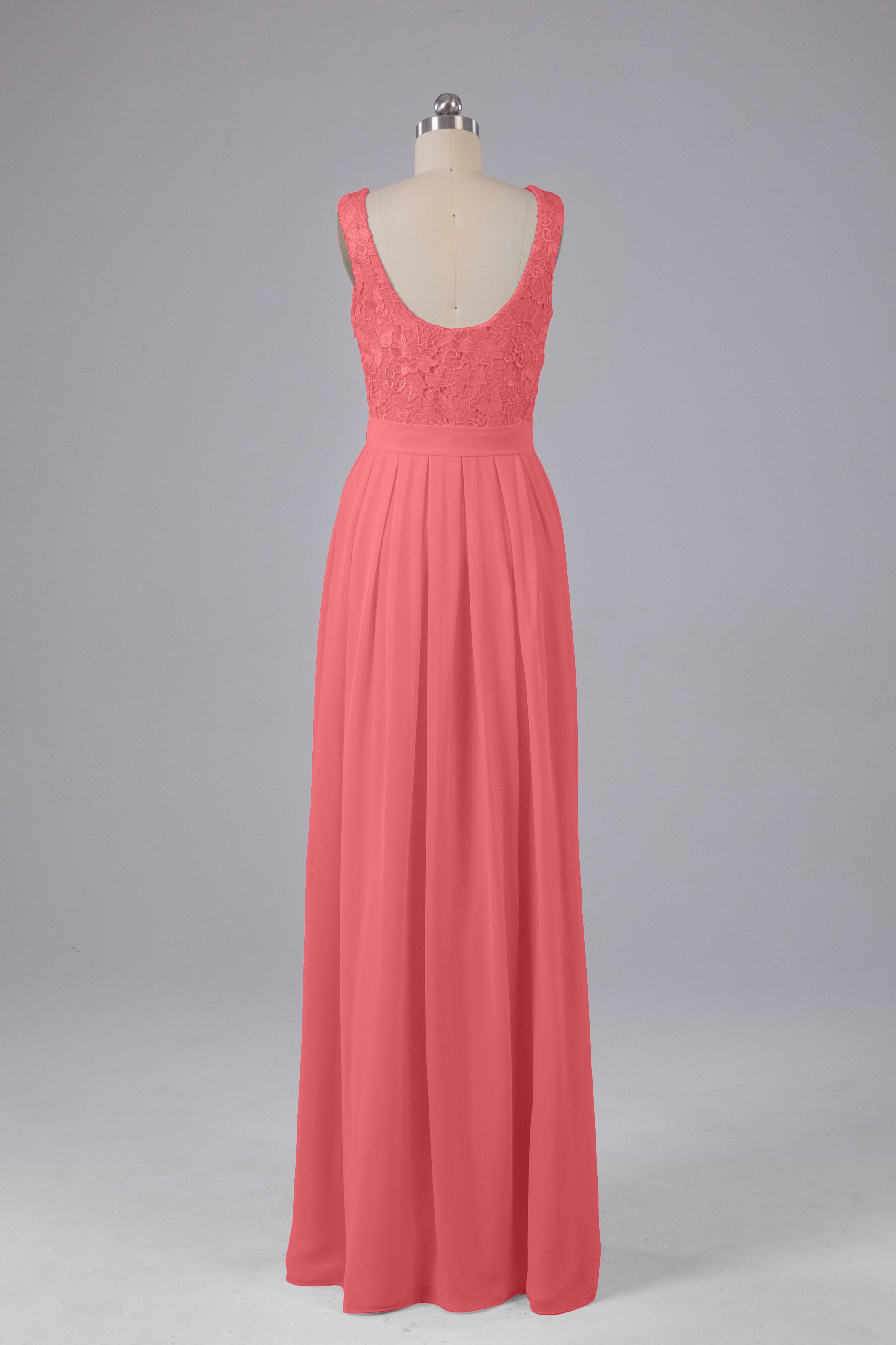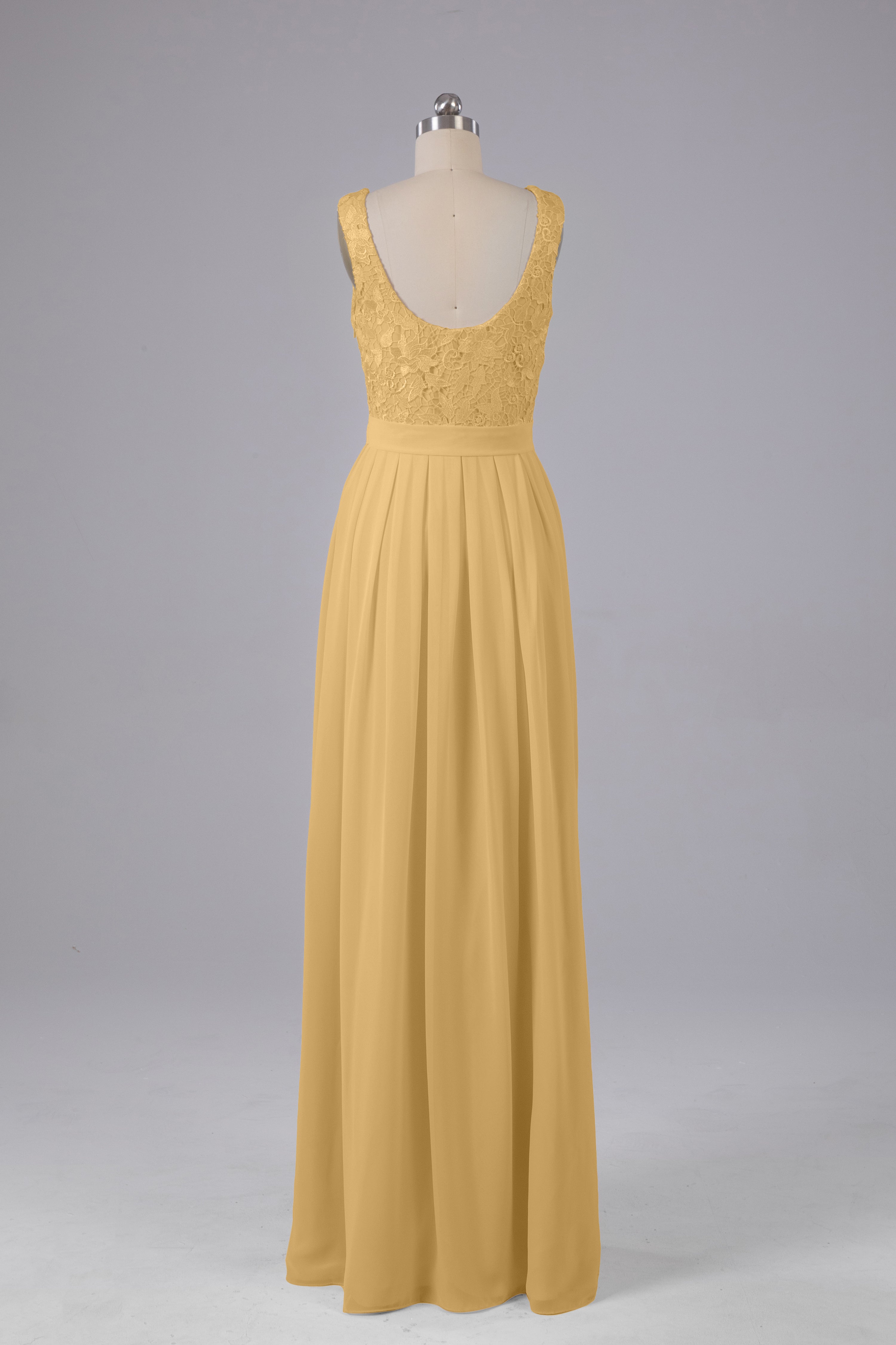 This floor-length bridesmaid dress features an A-line silhouette, delicate lace top, and flowing chiffon fabric. Perfect for any wedding, it offers a timeless and elegant look that will flatter all body types. Made with quality materials, this dress combines fashion and comfort for a memorable and stylish bridal party.