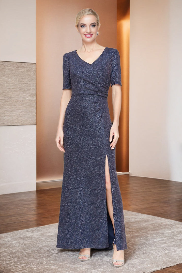 Sheath V Neck Shiny Short Sleeve Ankle Length Wedding Party Dress